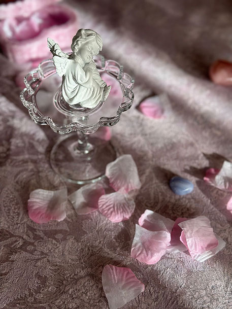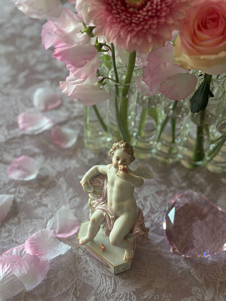 天使たちを鑑賞しながら、マイセンRoseのカップ&ソーサ―で茶菓をお楽しみ頂きます♪ 今回は、お一方ずつ色違いの薔薇のセットでご用意いたします。